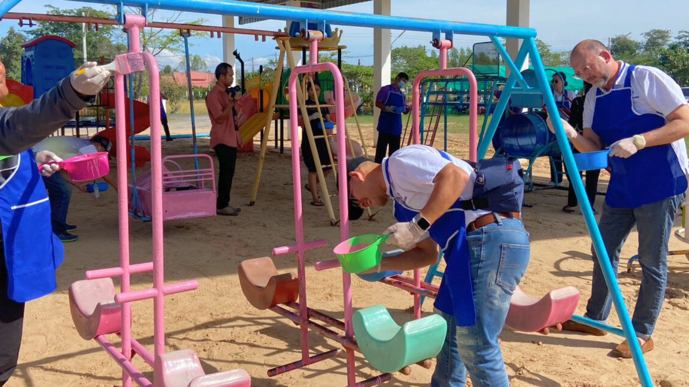 November 30, 2023. In the afternoon, the World Bank Thailand team, the DNPF’s management team, faculty members and students from Early Childhood Department, Surindra Rajabhat University, and the management team of Narong SAO joined hands in painting playground equipment and improving the surroundings of Narong SAO ECD Center.